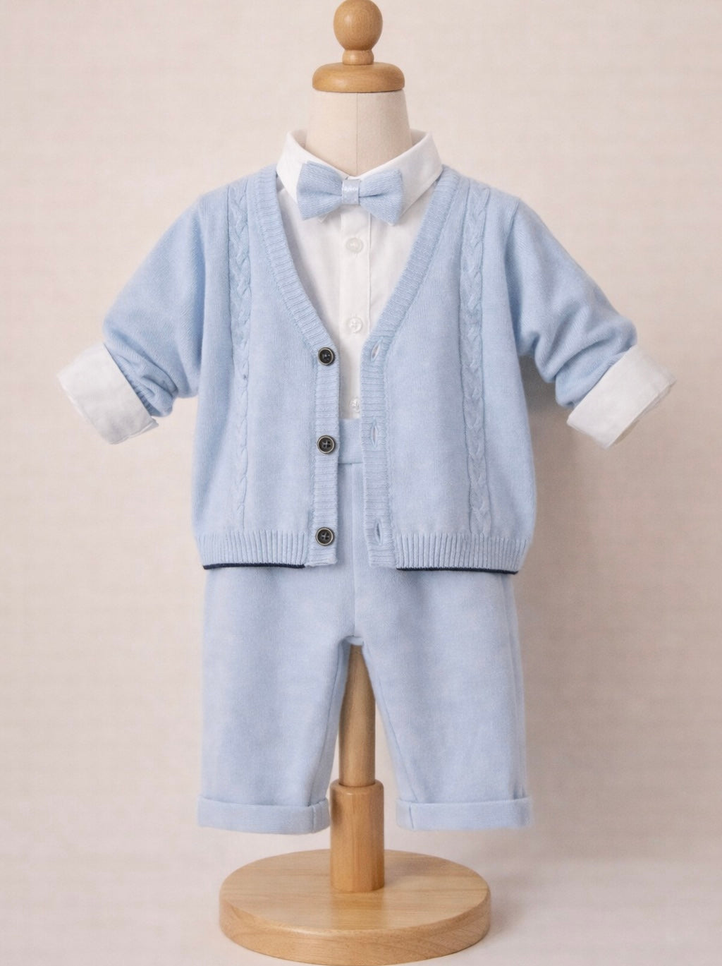 Set 4 piese elegant compus din cardigan tricotat cu nasturi, camasa tip body, papion si pantaloni din bumbac.
