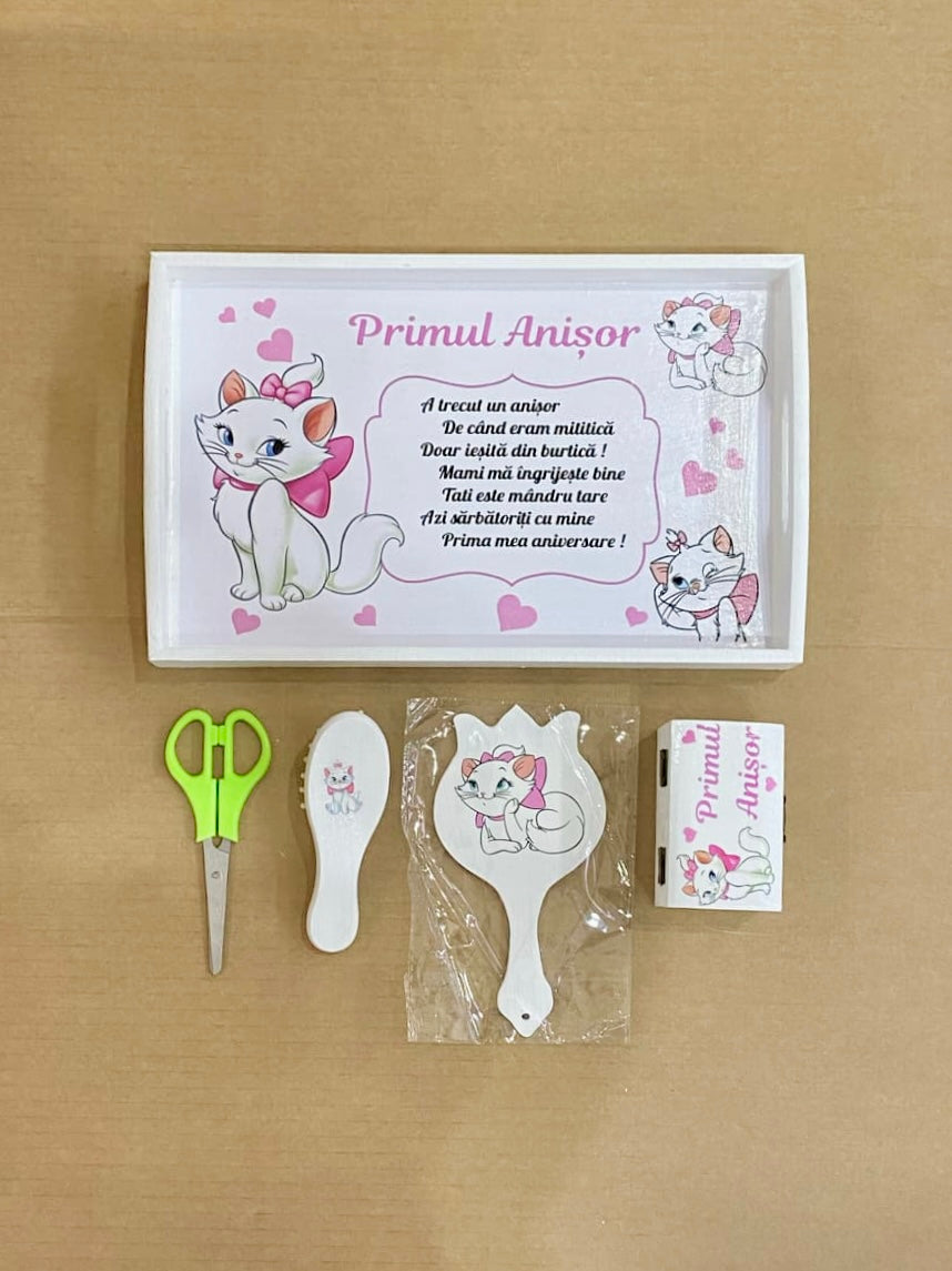 Set complet personalizat cu animatie Pisicuta Marie . Set pentru taiere de mot ce include 5 piese: tavita, perie, oglinda, cutiuta pentru prima suvita si foarfece.