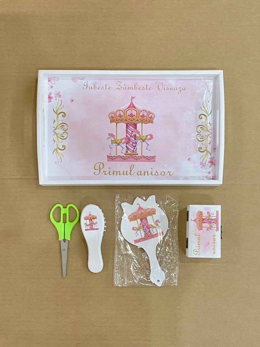 Set complet personalizat cu animatie carusel . Set pentru taiere de mot ce include 5 piese: tavita, perie, oglinda, cutiuta pentru prima suvita si foarfece.