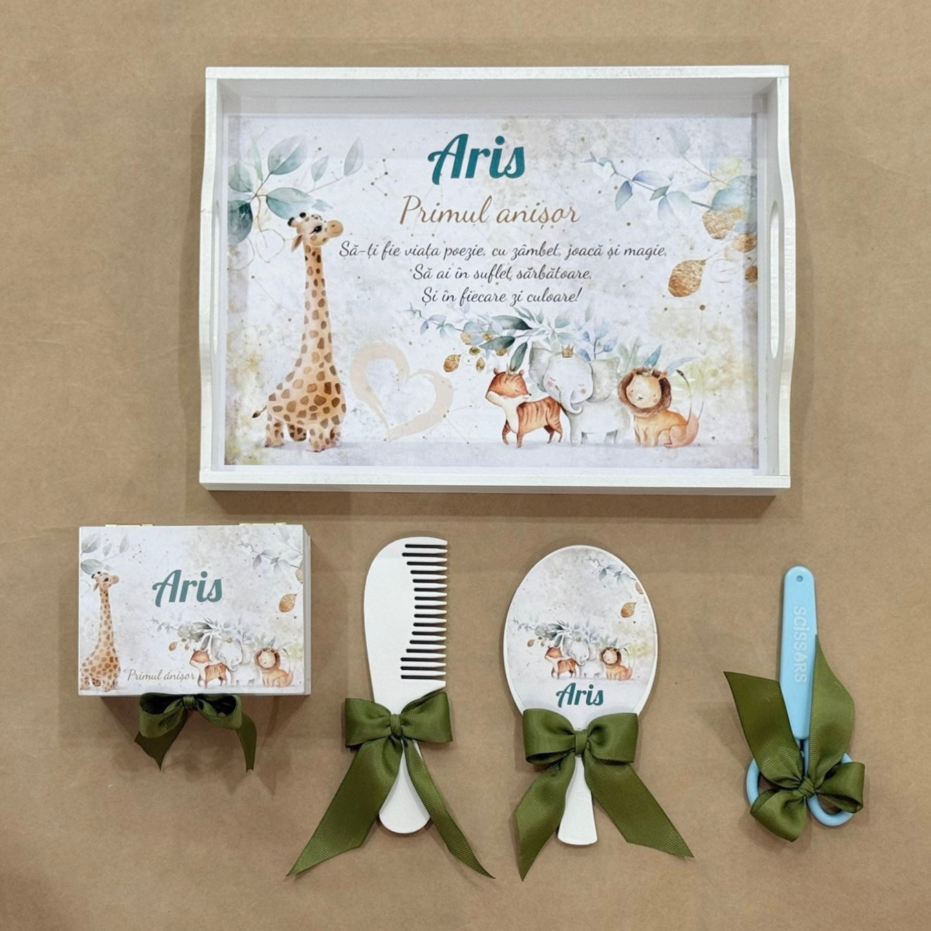 Set pentru mot complet personalizat in tema leut/ safari . Set pentru taiere de mot ce include 5 piese: tavita, perie, oglinda, cutiuta pentru prima suvita si foarfece.
