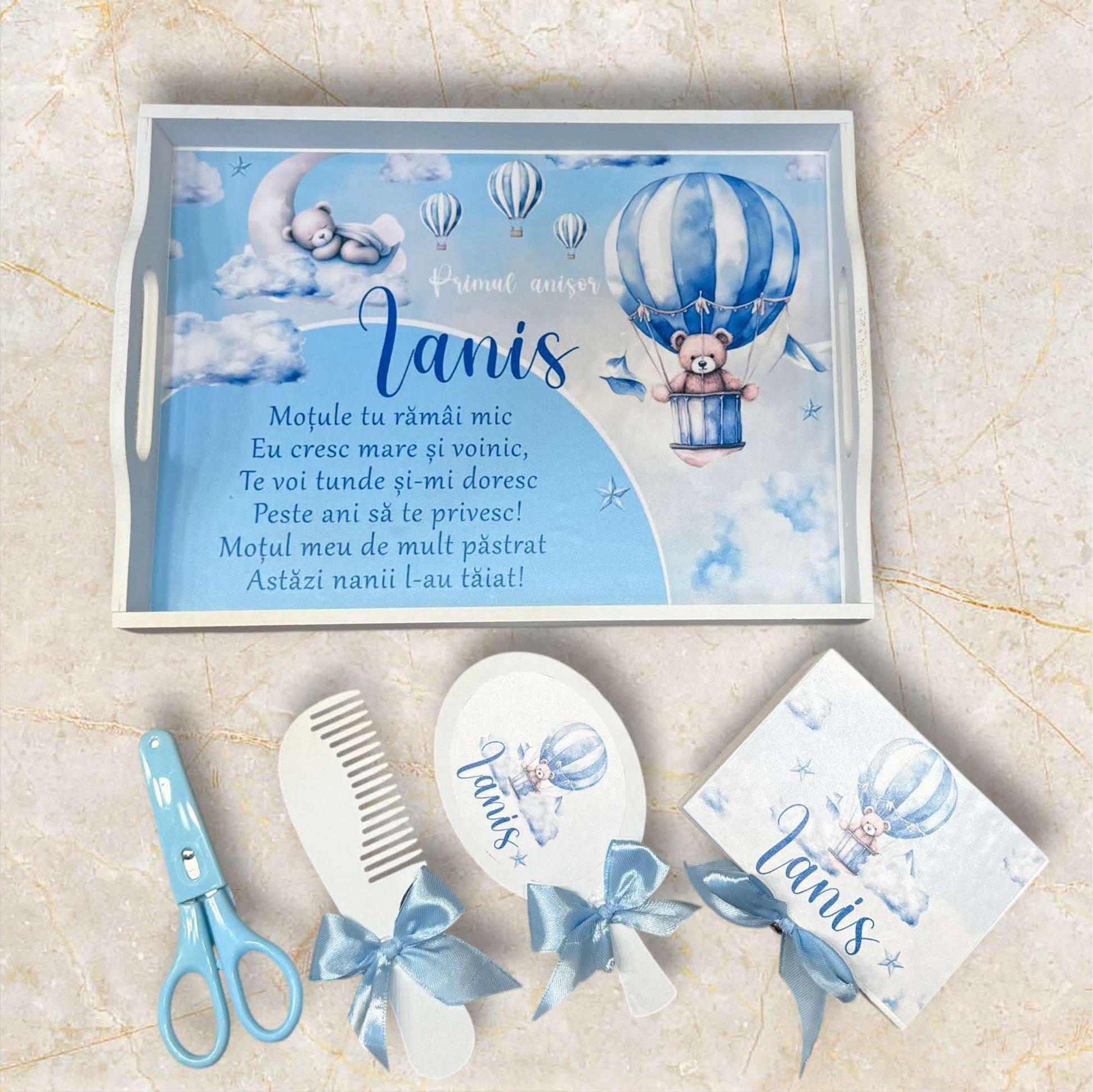 Set complet personalizat cu animatie ursulet in balon . Set pentru taiere de mot ce include 5 piese: tavita, perie, oglinda, cutiuta pentru prima suvita si foarfece.