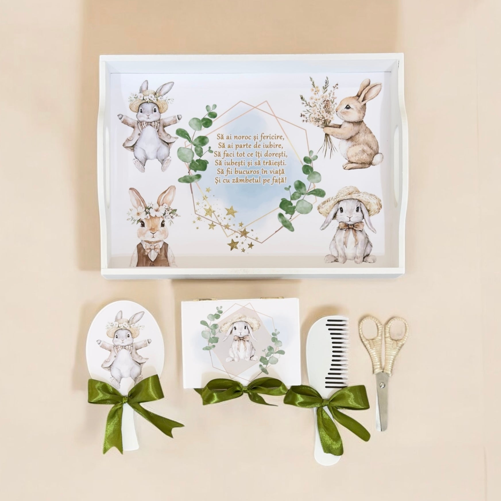 Set pentru mot complet personalizat in tema iepuras . Set pentru taiere de mot ce include 5 piese: tavita, perie, oglinda, cutiuta pentru prima suvita si foarfece.