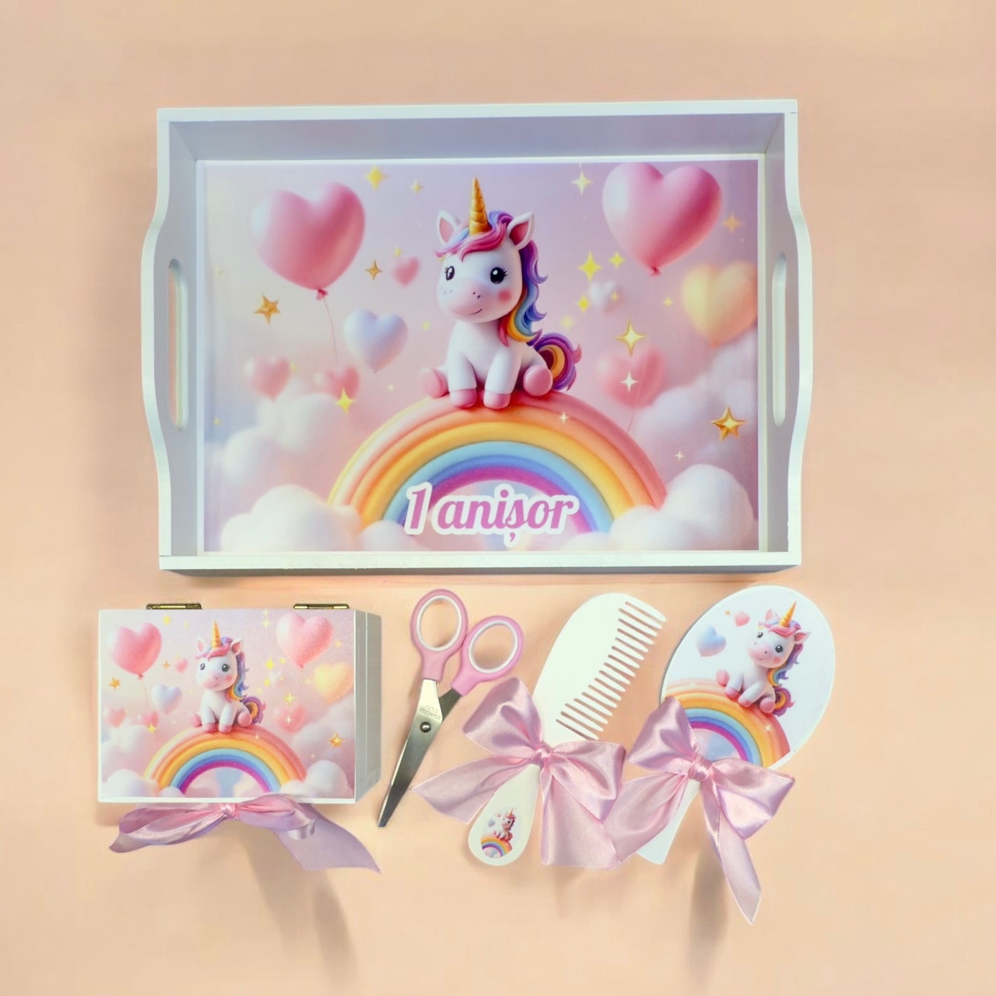 Set pentru mot complet personalizat in tema unicorn . Set pentru taiere de mot ce include 5 piese: tavita, perie, oglinda, cutiuta pentru prima suvita si foarfece.