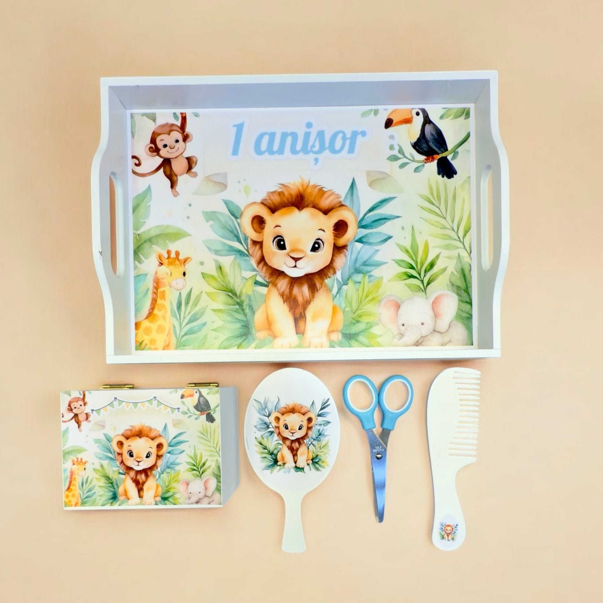 Set pentru mot complet personalizat in tema leut/ safari . Set pentru taiere de mot ce include 5 piese: tavita, perie, oglinda, cutiuta pentru prima suvita si foarfece.