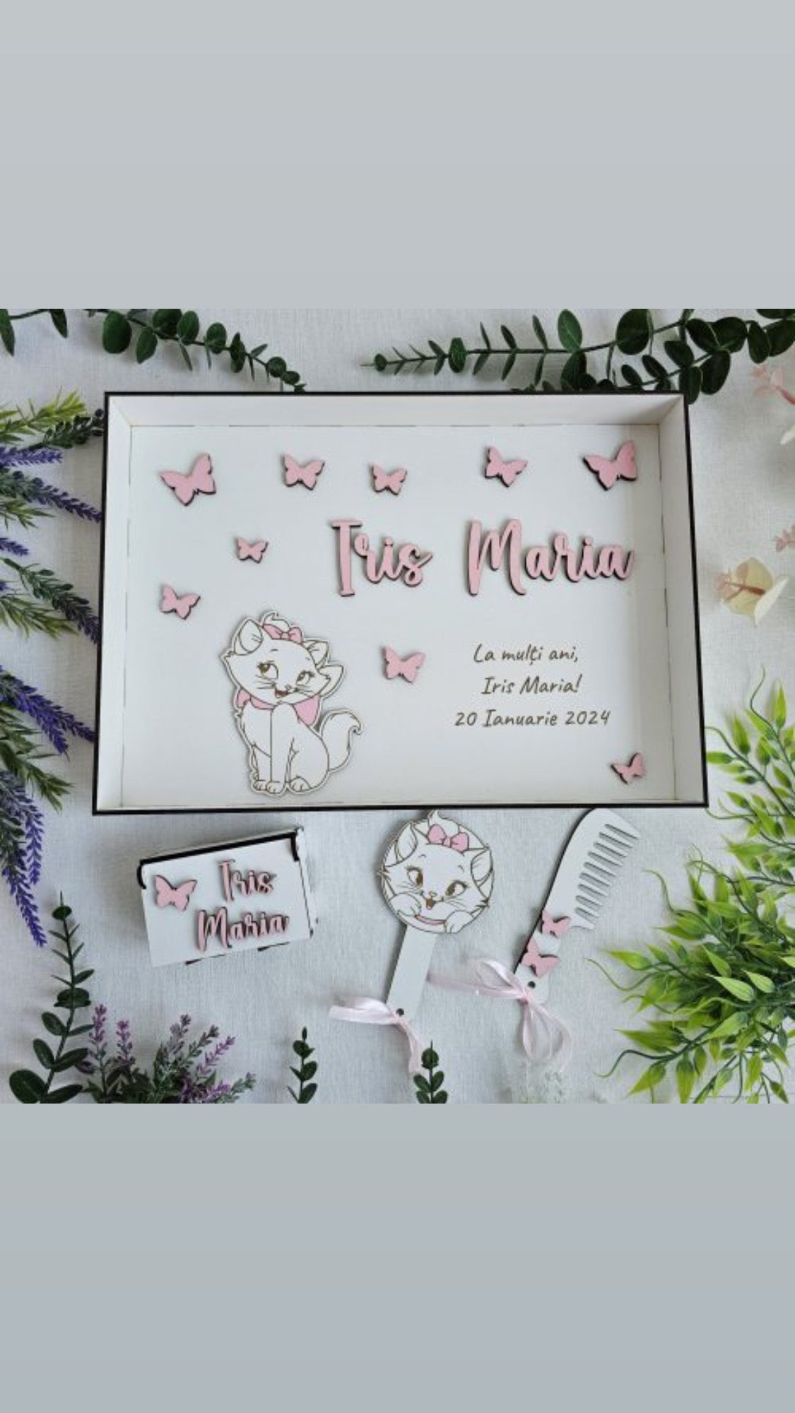 Set complet personalizat cu animatie pisicuta Marie . Set pentru taiere de mot ce include 5 piese: tavita, perie, oglinda, cutiuta pentru prima suvita si foarfece