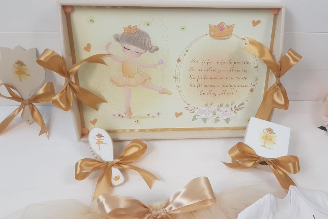 Set complet personalizat cu animatie balerina . Set pentru taiere de mot ce include 5 piese: tavita, perie, oglinda, cutiuta pentru prima suvita si foarfece