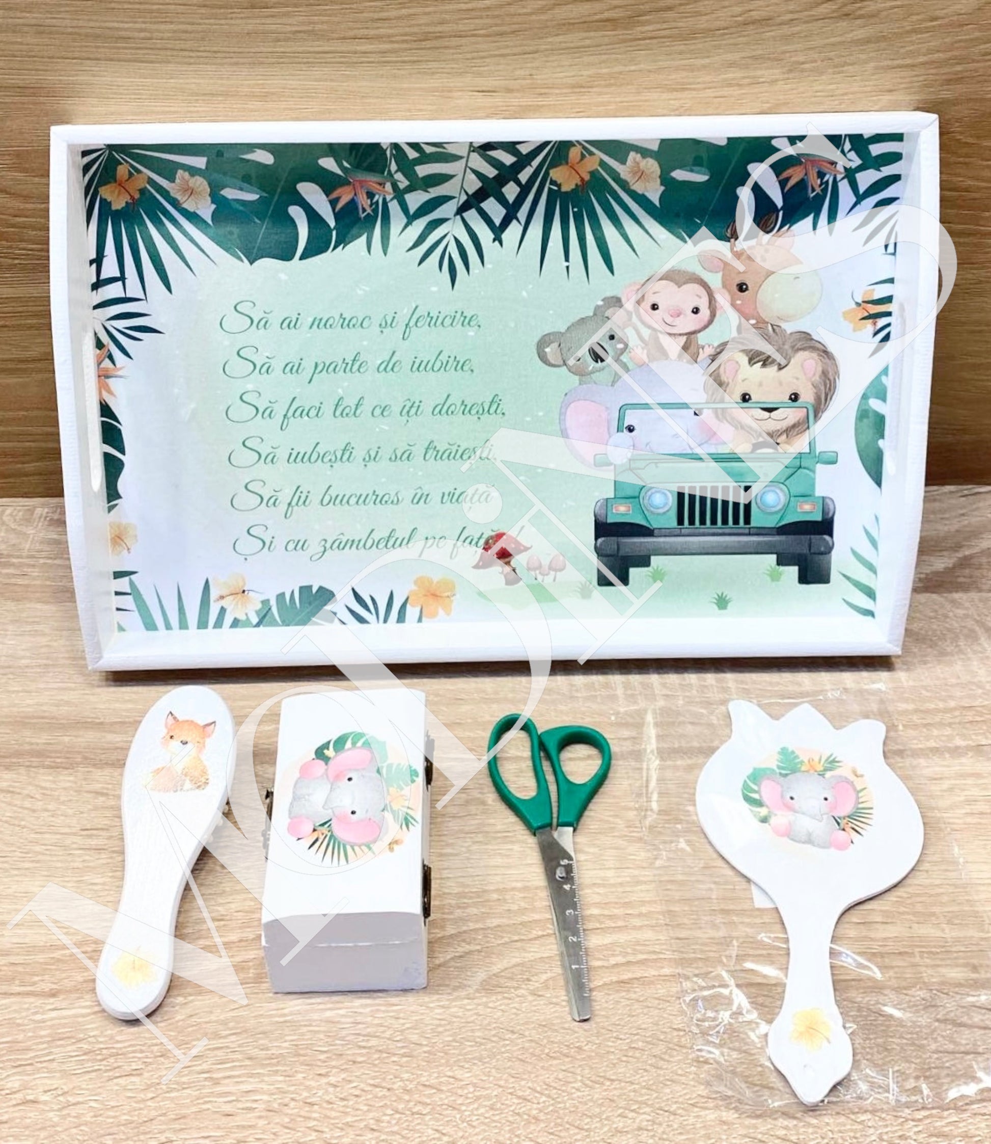 Setul contine tavita, perie, oglinda, foarfeca, creion si cutiuta suvita de par