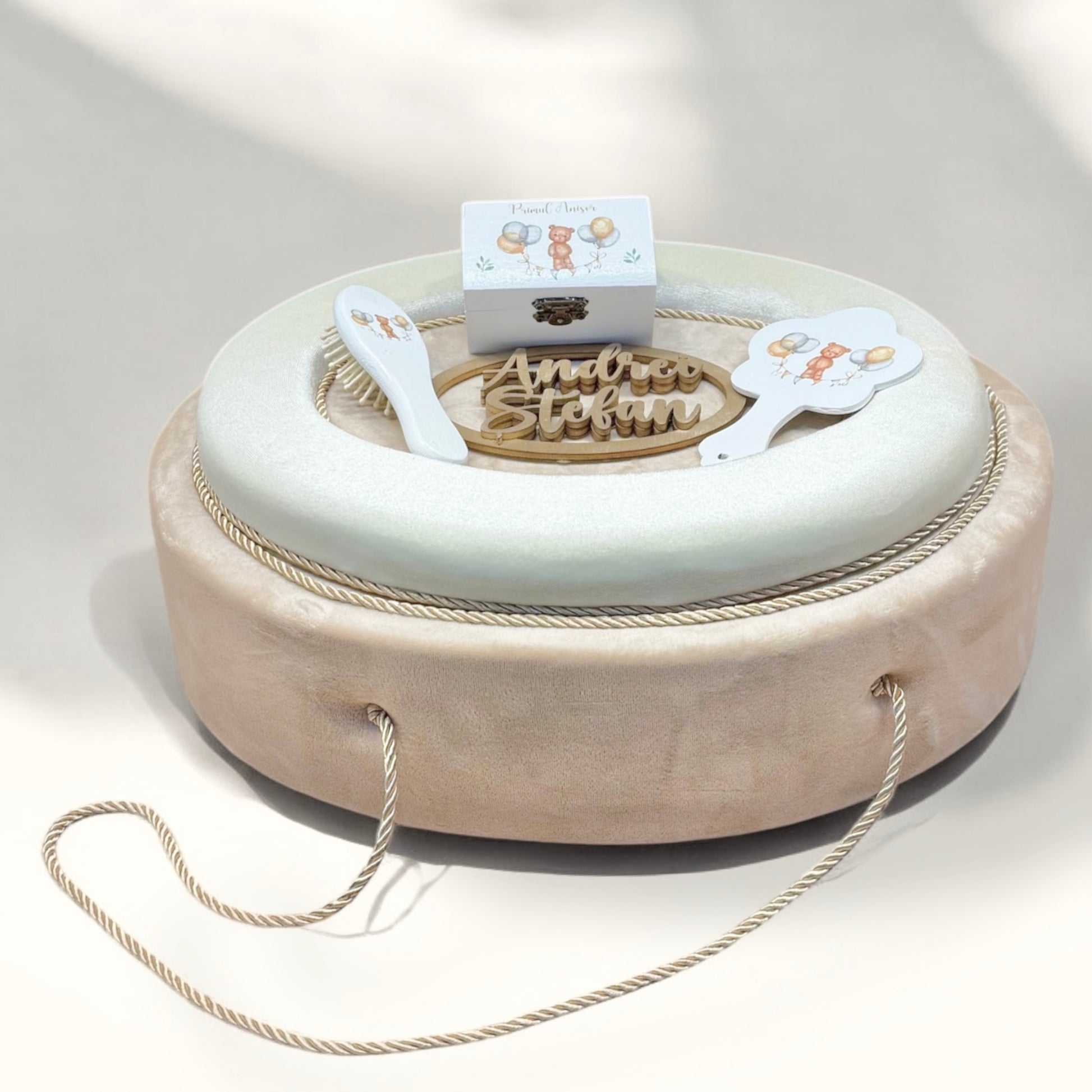 Set aniversar personalizat ce include cutie tăviță și accesorii precum perie oglindă foarfece și cutiuță pentru prima șuviță. Setul se poate realiza pe diferite culori adăugându-se imaginea sau personalizarea dorită de către client. Comanda se confirmă telefonic sau ne poți contacta pentru alte detalii la 0743868873