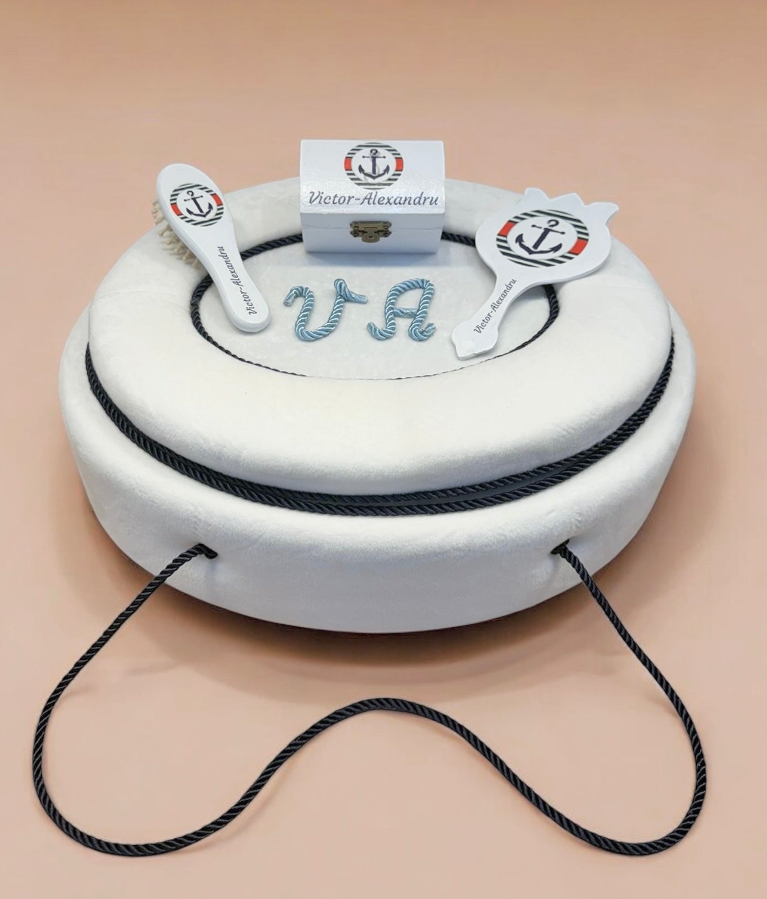 Set aniversar personalizat ce include cutie tăviță și accesorii precum perie oglindă foarfece și cutiuță pentru prima șuviță. Setul se poate realiza pe diferite culori adăugându-se imaginea sau personalizarea dorită de către client. Comanda se confirmă telefonic sau ne poți contacta pentru alte detalii la 0743868873