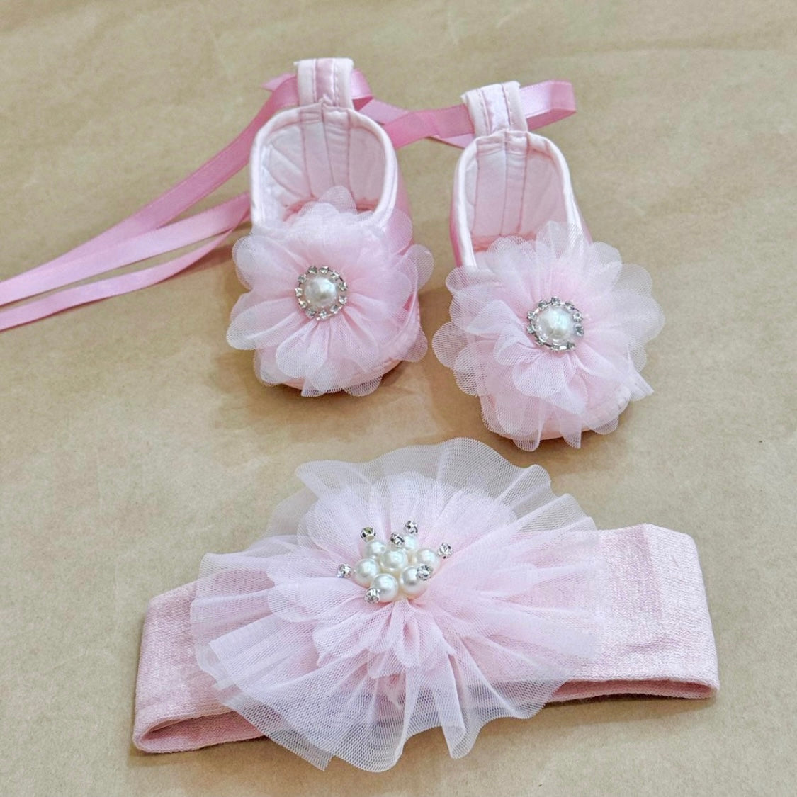 Set compus din incaltaminte nou-nascut pentru fetite satinati cu floare din tulle si strasuri argintii cu sistem de inchidere cu siret si bentita din bumbac asortata. Incaltaminte bebe fete pentru ocazie precum botez sau alte evenimente.