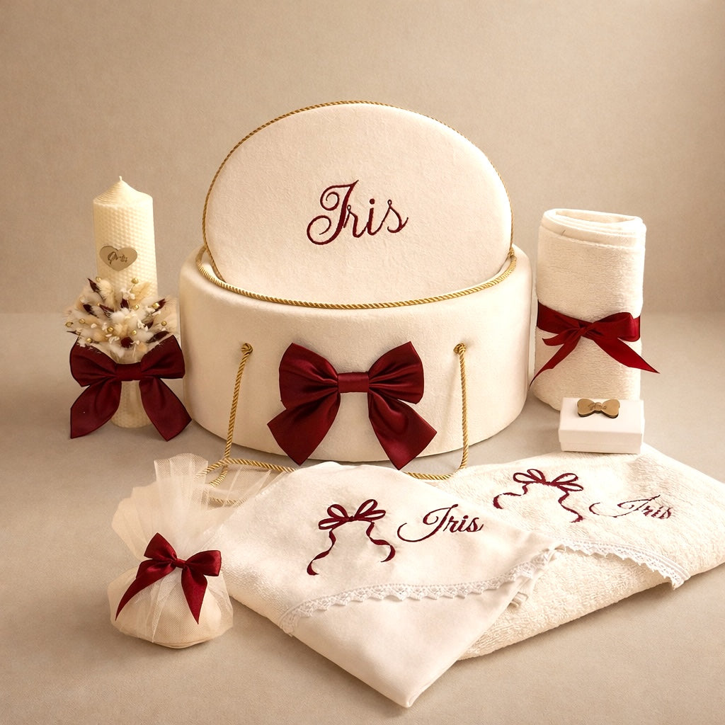 -trusou din bumbac brodat ( prosop bebe, prosop preot, pânză mir, cutie prima șuviță, sticluță mir și săpun preot)