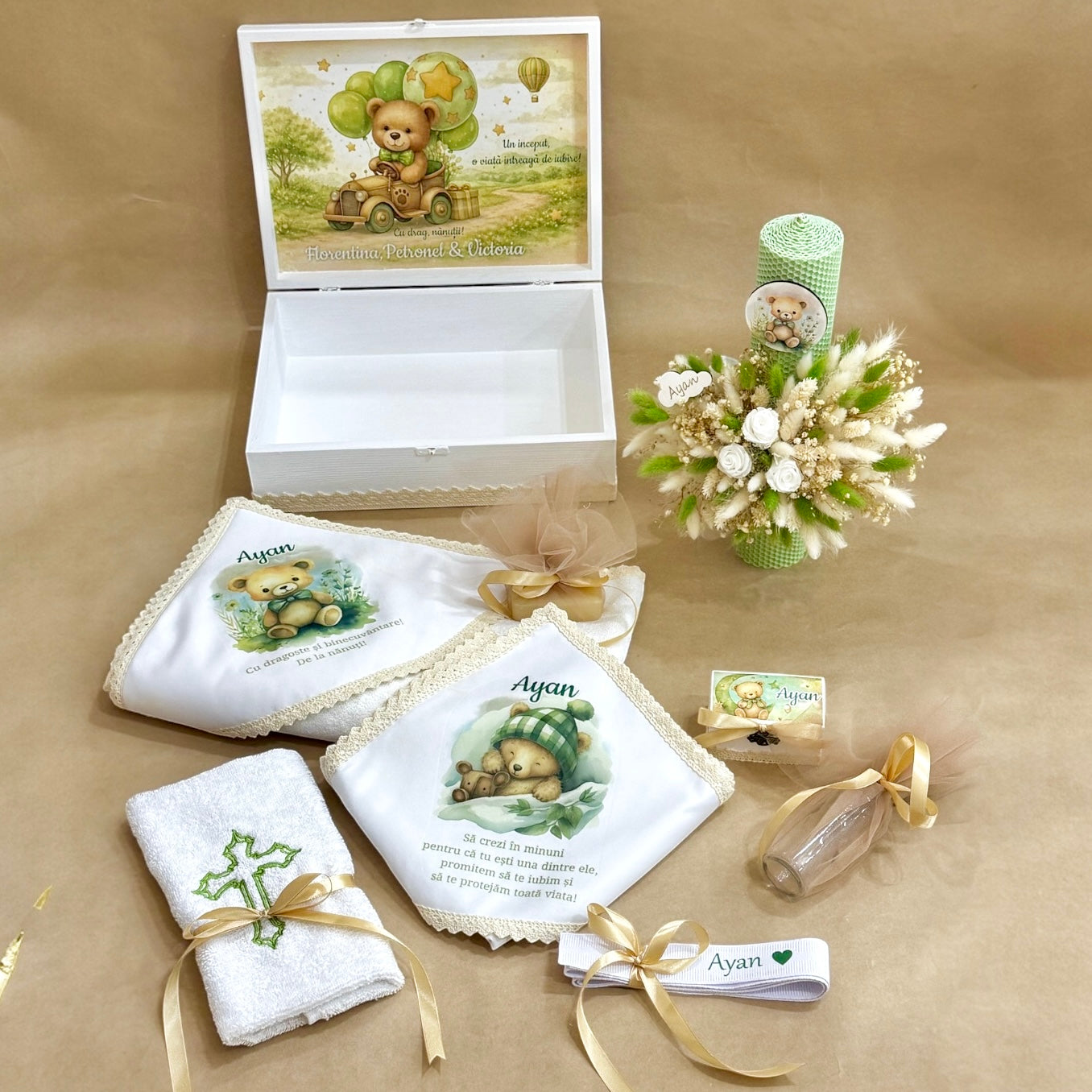 Set complet pentru botez potrivit pentru baiat sau fetita ce include: