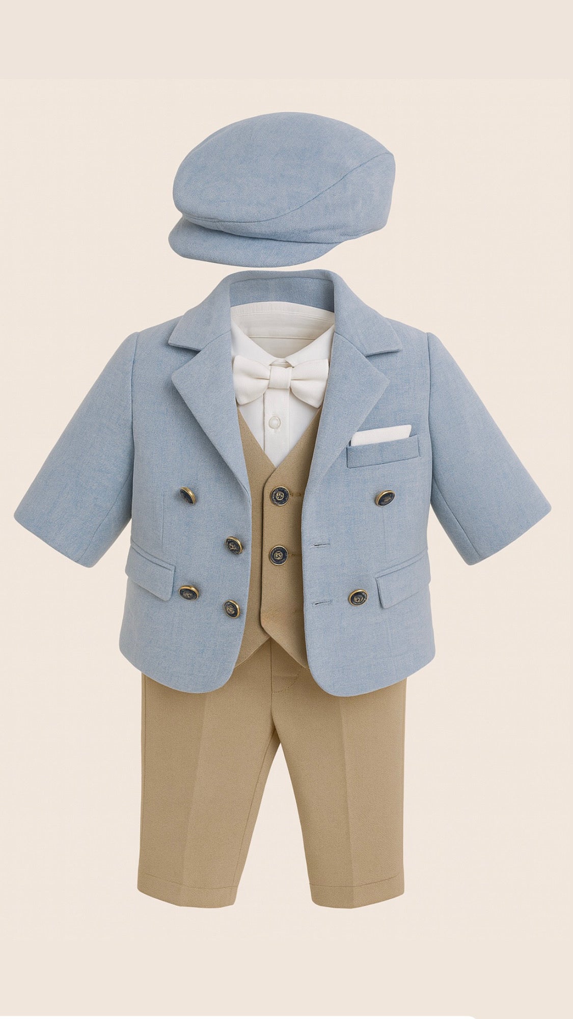 Costum compus din sacou din stofa captusit, camasa, vesta, papion si pantaloni si bascuta. Potrivit pentru evenimente precum botez dar nu numai, bebelusul tau va arata exceptional intr-un outfit perfect asortat in sezonul rece!