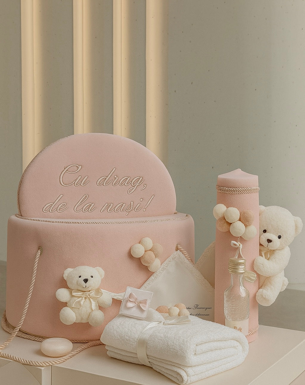 Acest set complet este creat ca un simbol al grijii și dragostei din partea nașilor, iar elementele delicate – broderiile fine, decorațiunile artizanale și teddy bear-ul pufos – transformă trusoul într-o adevărată amintire prețioasă.