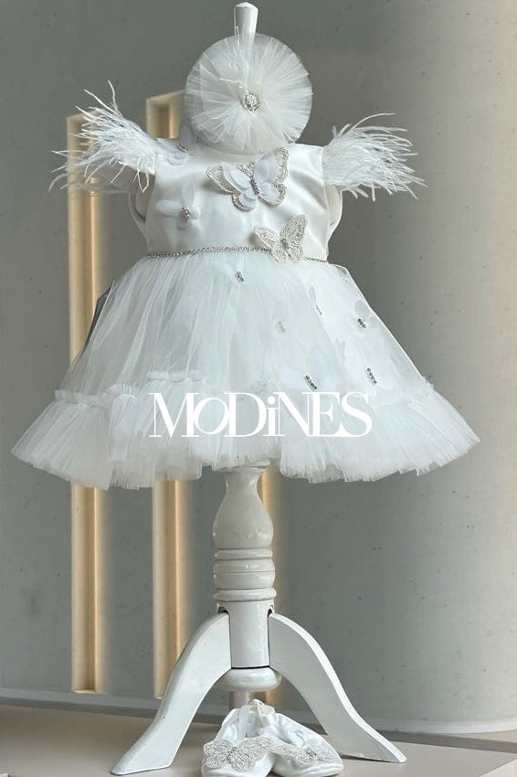 Set pentru botez compus din rochita, bentita si papucei. model deosebit cu detalii pretioase precum fluturasi, strasuri si pene