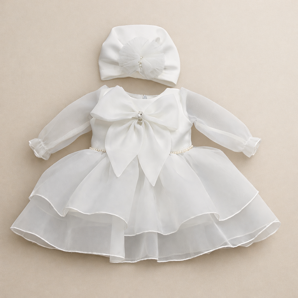 Setul contine rochita sibturban. Outfit potrivit pentru botez sau alte evenimente baby.