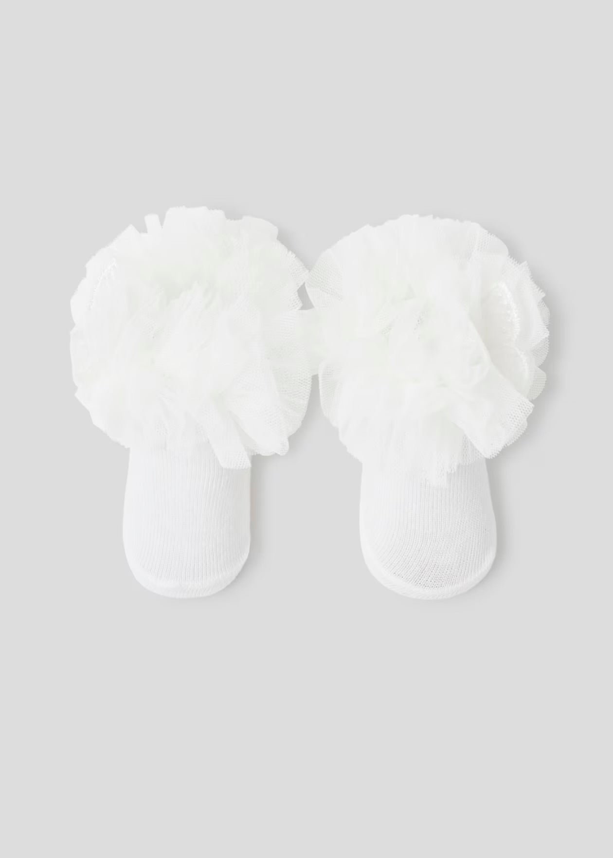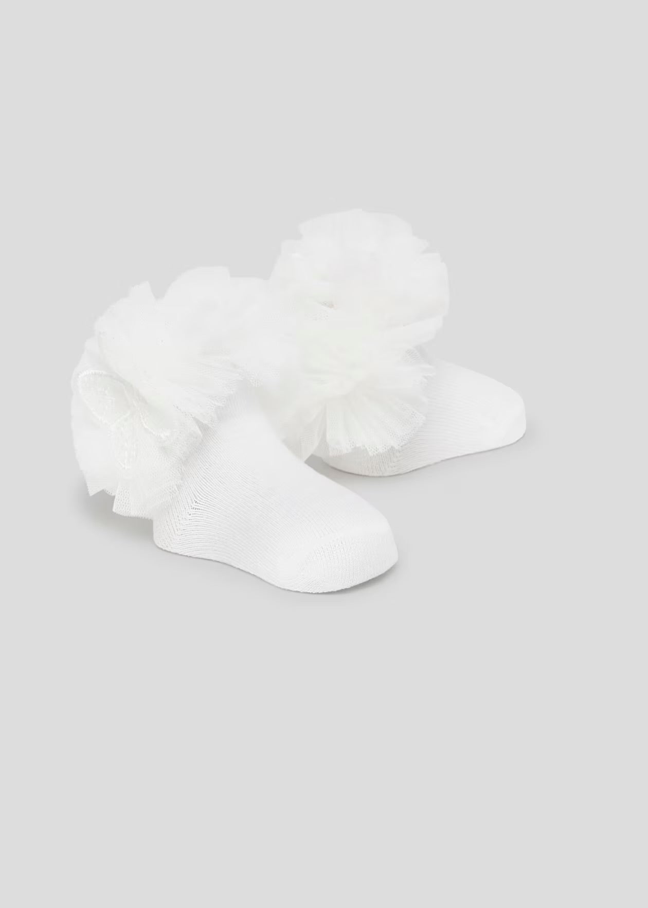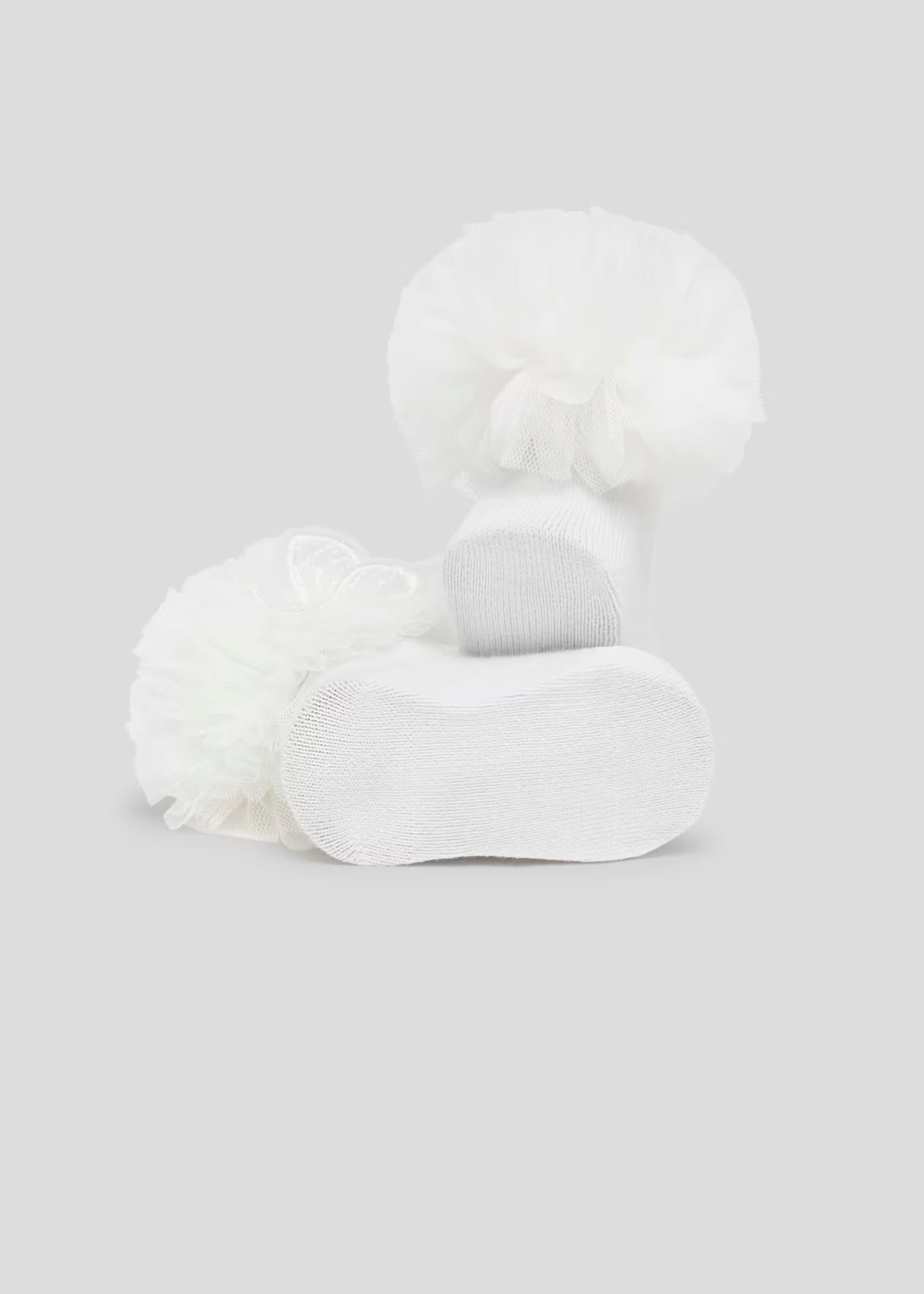Sosete pentru nou-nascut. Un accesoriu perfect pentru a completa tinuta copilului, oferindu-i un aer diferit. Elemente decorative: volanase.