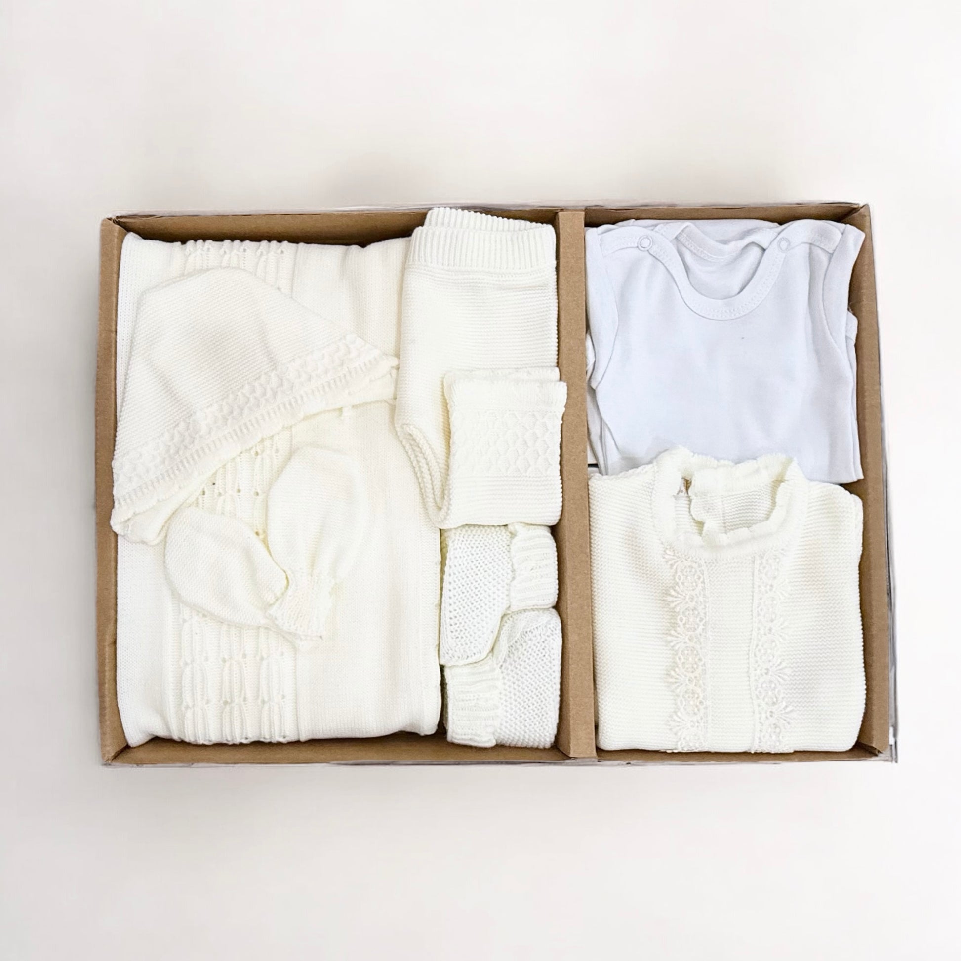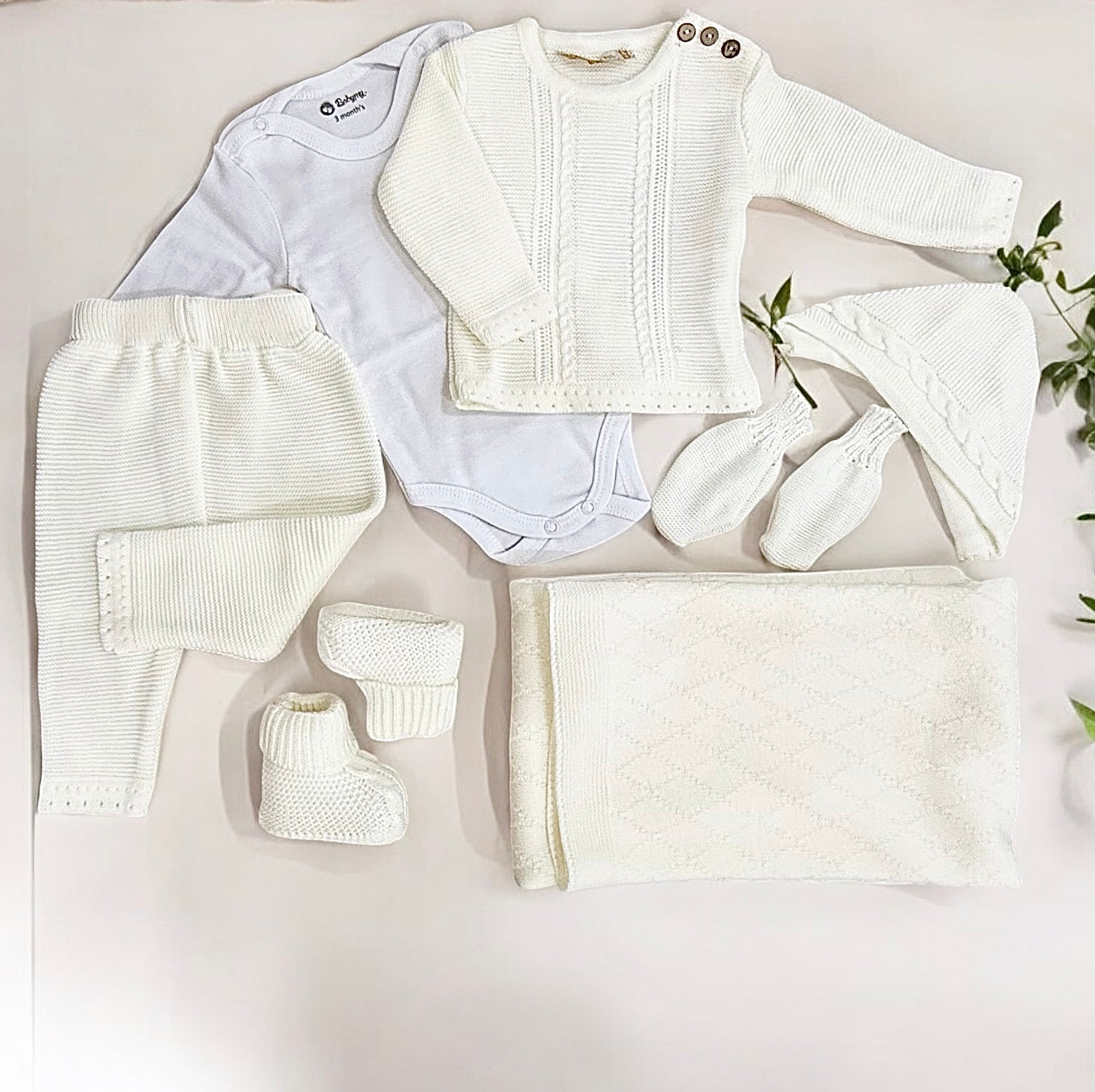 Set bebe din 5 piese. Setul este compus din body, pantaloni tricotati, bluzita tricotat, tricotata, manusi tricotate, papucei tricotat si paturica tricotata. Set pentru baieti ideal pentru cadou de nou-nascut, pentru evenimente precum botez , prima baita sau pentru tinutele de zi cu zi . Setul vine ambalat intr-o cutie cadou