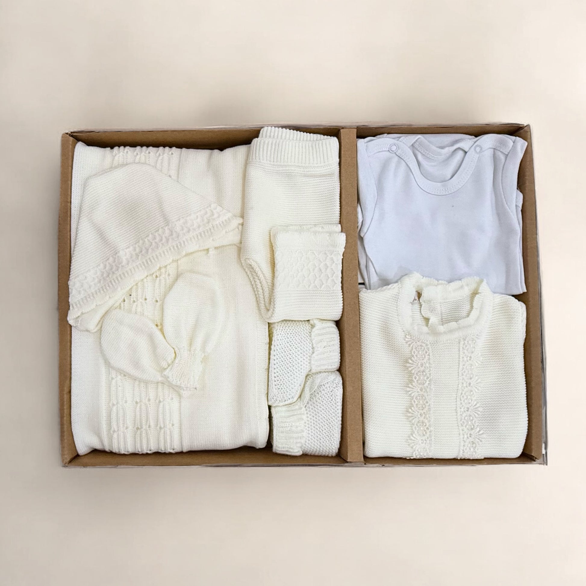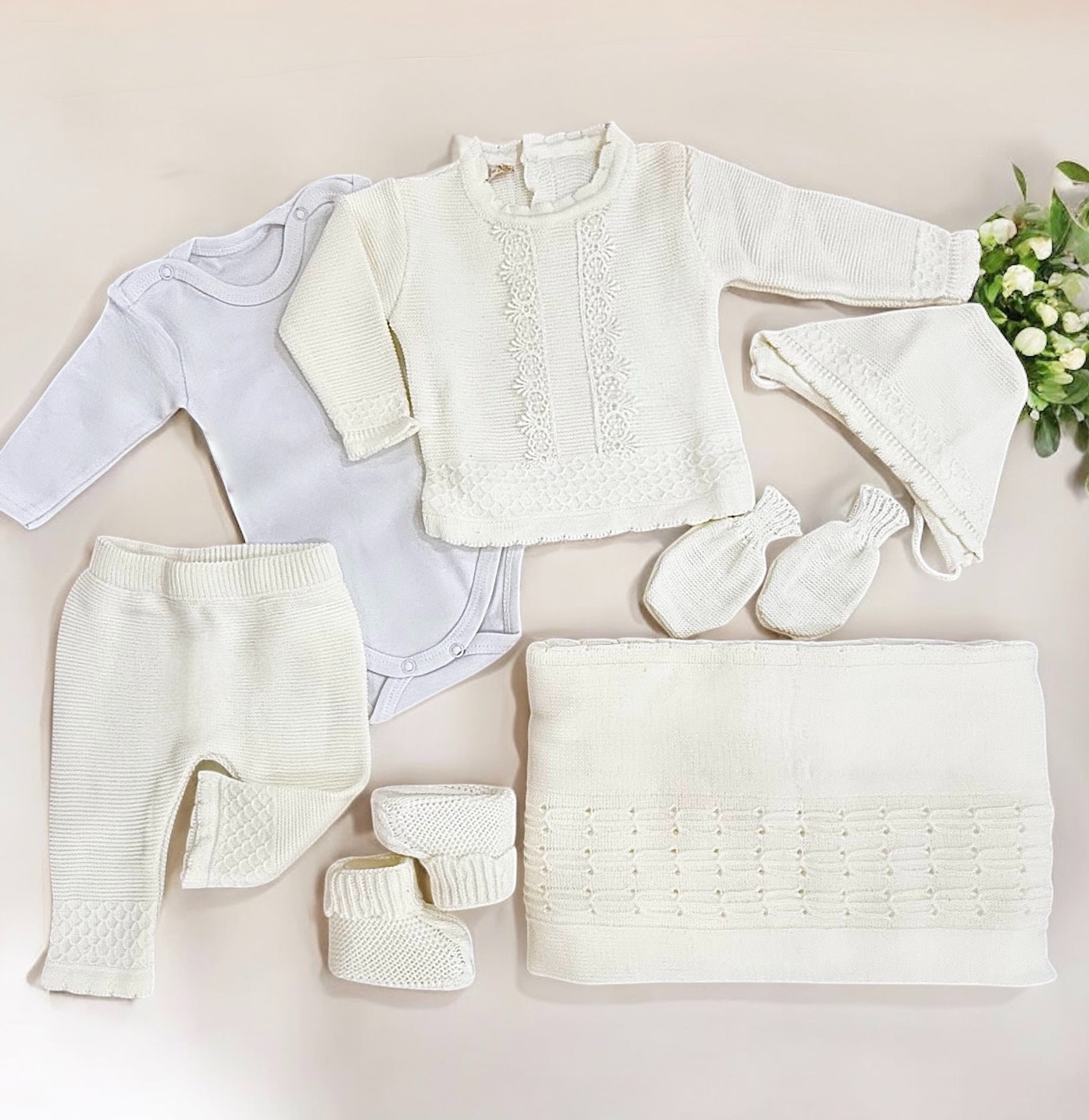 Set bebe din 5 piese. Setul este compus din body, pantaloni tricotati, bluzita tricotat, tricotata, manusi tricotate, papucei tricotat si paturica tricotata. Set pentru fetite ideal pentru cadou de nou-nascut, pentru evenimente precum botez , prima baita sau pentru tinutele de zi cu zi . Setul vine ambalat intr-o cutie cadou.