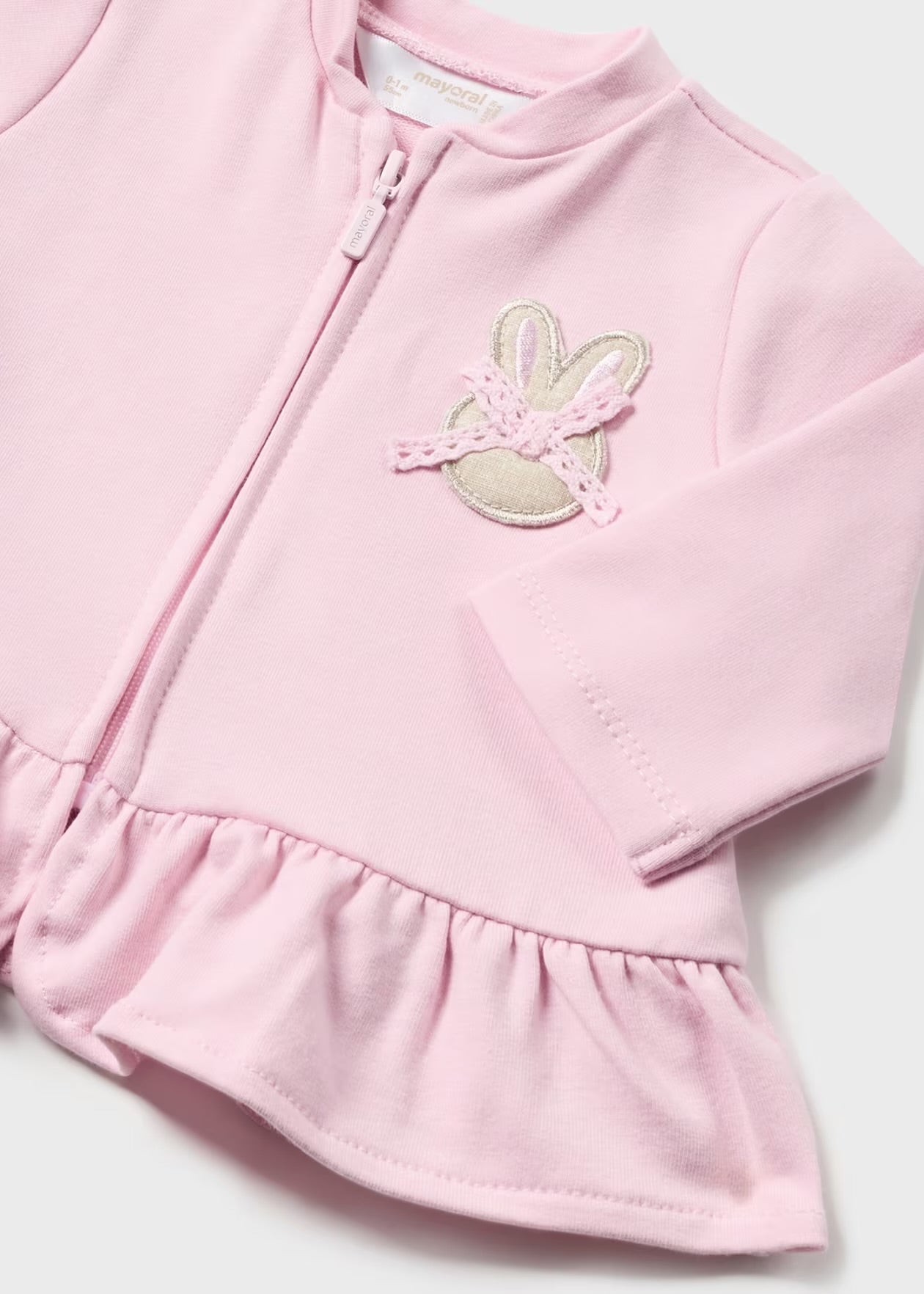 Hanorac cu maneca lunga pentru nou-nascut. Guler bomber. Inchidere centrala cu fermoar. Design cu volanas decorativ pe tiv. Design cu imprimeu.