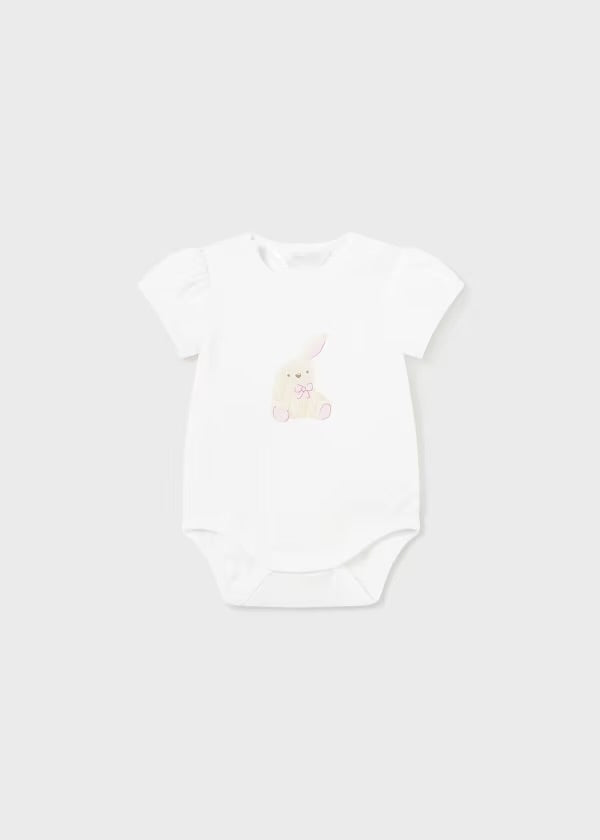 Body cu maneca scurta pentru nou-nascut. Guler rotund. Capse intre picioare pentru a facilita imbracarea articolului.