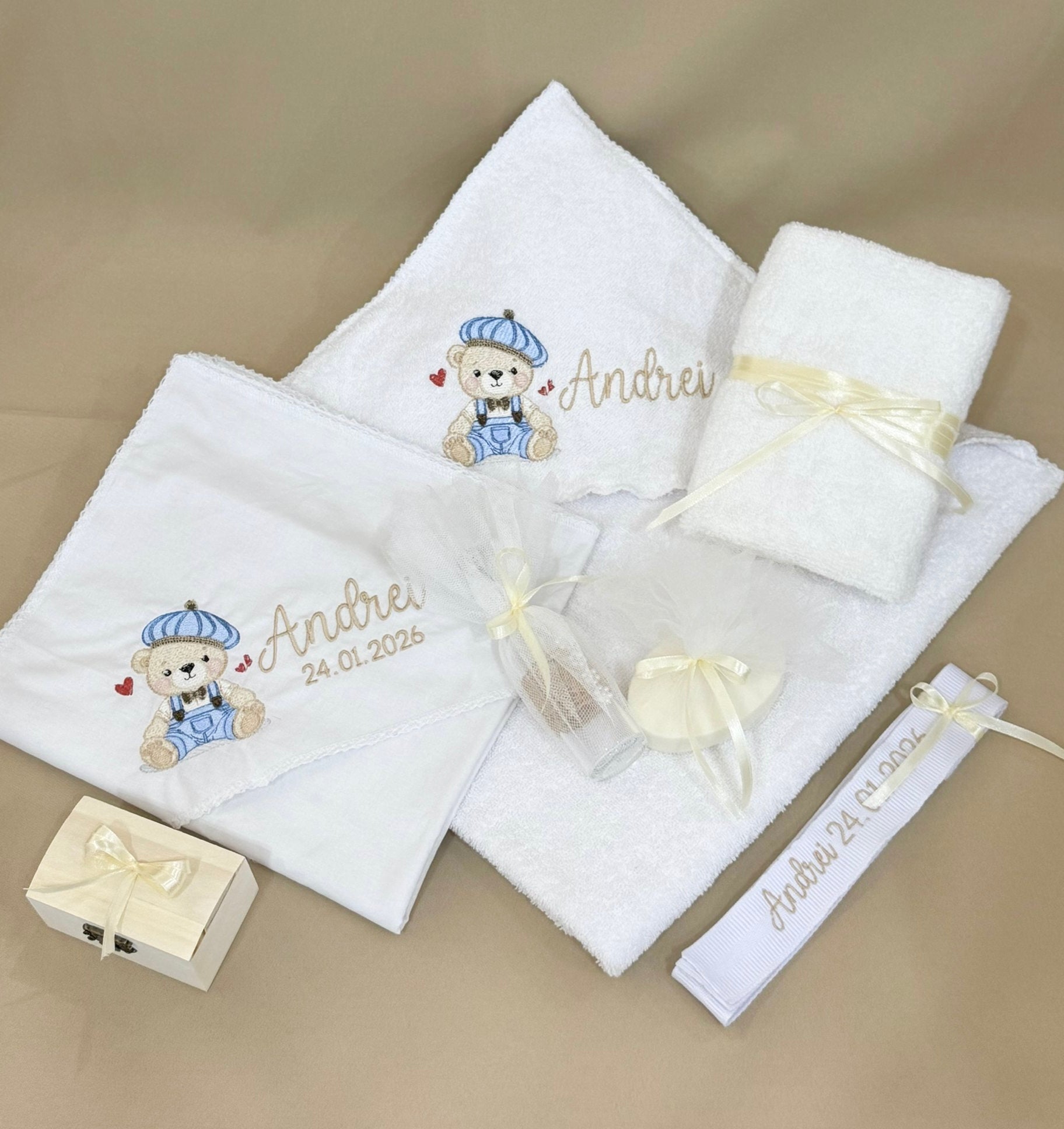 Trusou personalizat botez pentru brodat botez nou-nascut este compus din prosop mare, prosop mic, crisma, fasa, sapun, cutie prima suvita, sticluta mir. Trusoul este printat cu imaginea si detaliile dorite de catre client. Tema din imagine este ursulet , potrivita pentru baiat