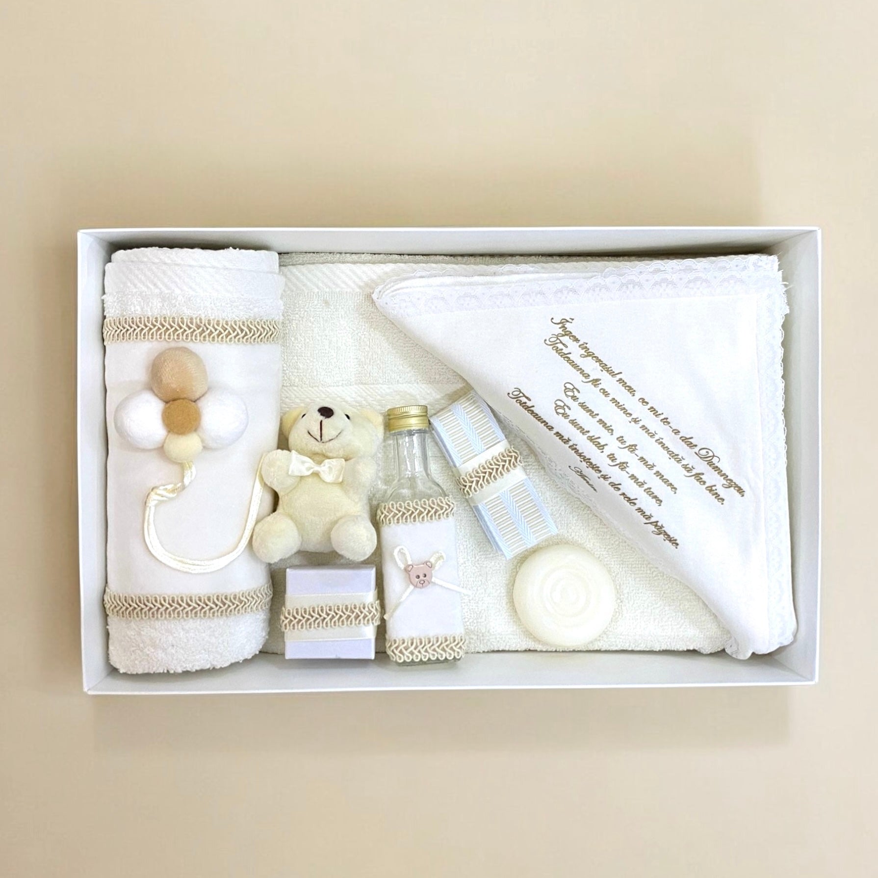 Trusoul este compus din prosop bebe, prosop preot, crisma/ panza mir, fasa, sapun, cutie prima suvita, sticluta mir.