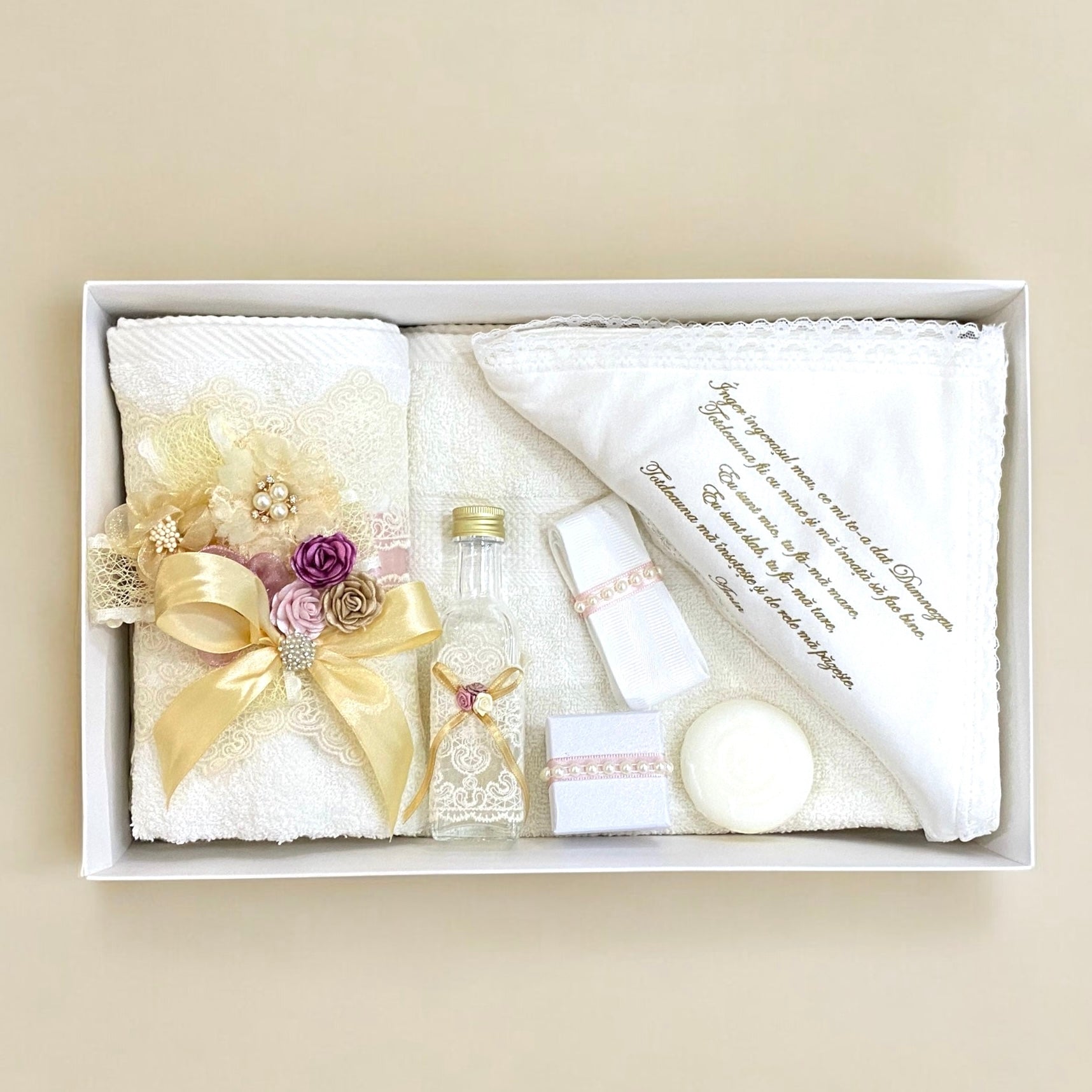 Trusoul este compus din prosop bebe, prosop preot, crisma/ panza mir, fasa, sapun, cutie prima suvita, sticluta mir.