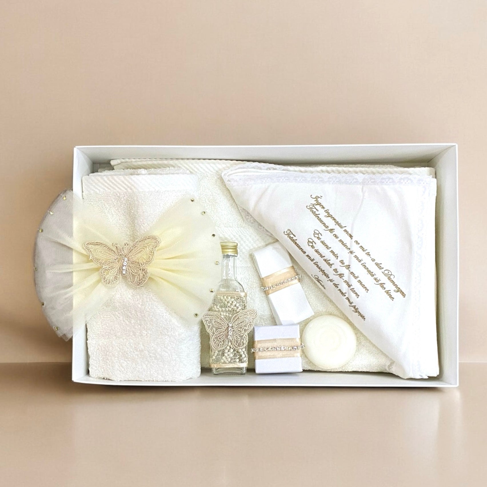 Trusoul este compus din prosop bebe, prosop preot, crisma/ panza mir, fasa, sapun, cutie prima suvita, sticluta mir.