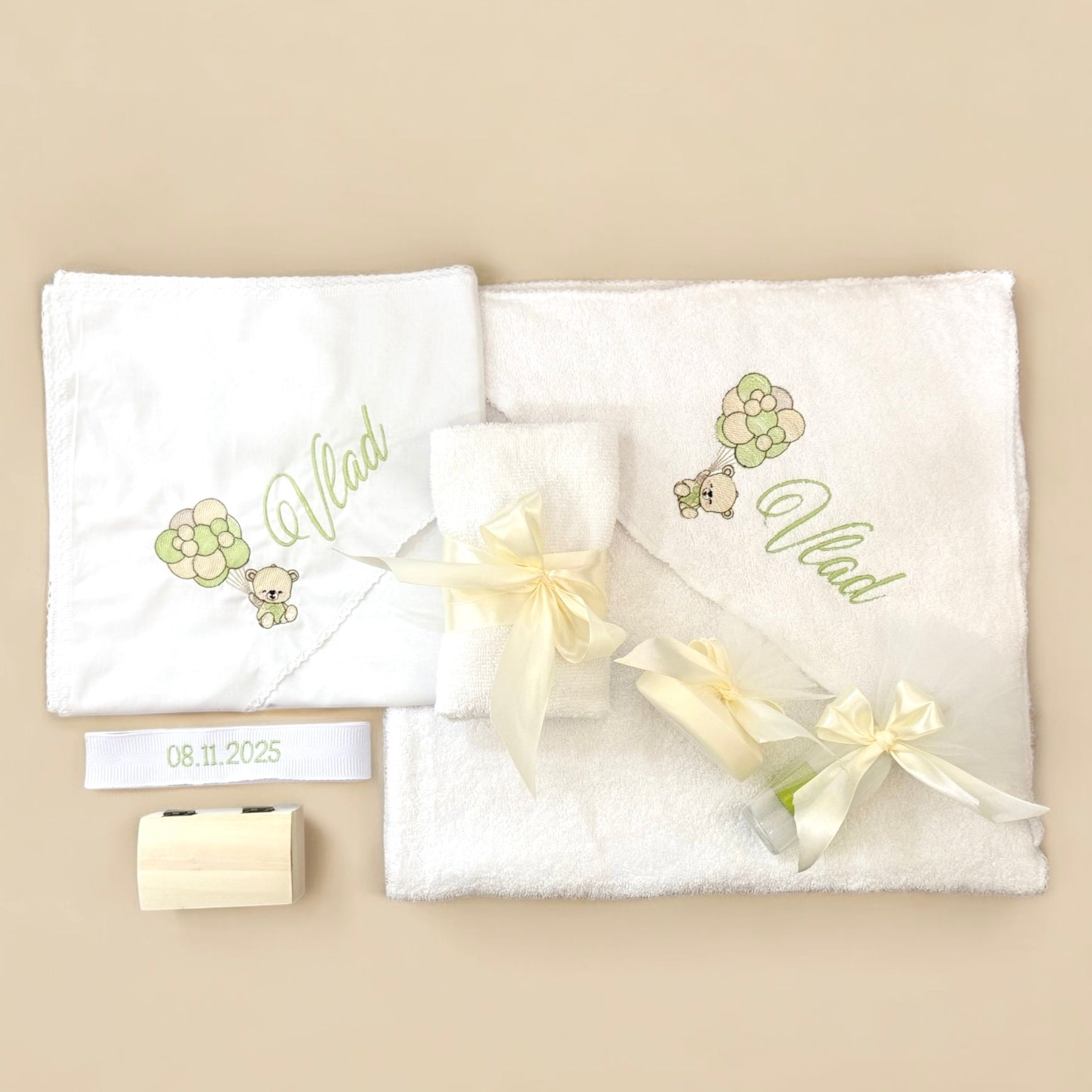 Trusoul personalizat brosat pentru botez fetite sau baiat nou-nascut este compus din prosop mare, prosop mic, crisma, fasa, sapun, cutie prima suvita, sticluta mir. Trusoul este brodat cu imaginea si detaliile dorite de catre client. Tema din imagine este ursulet cu baloane