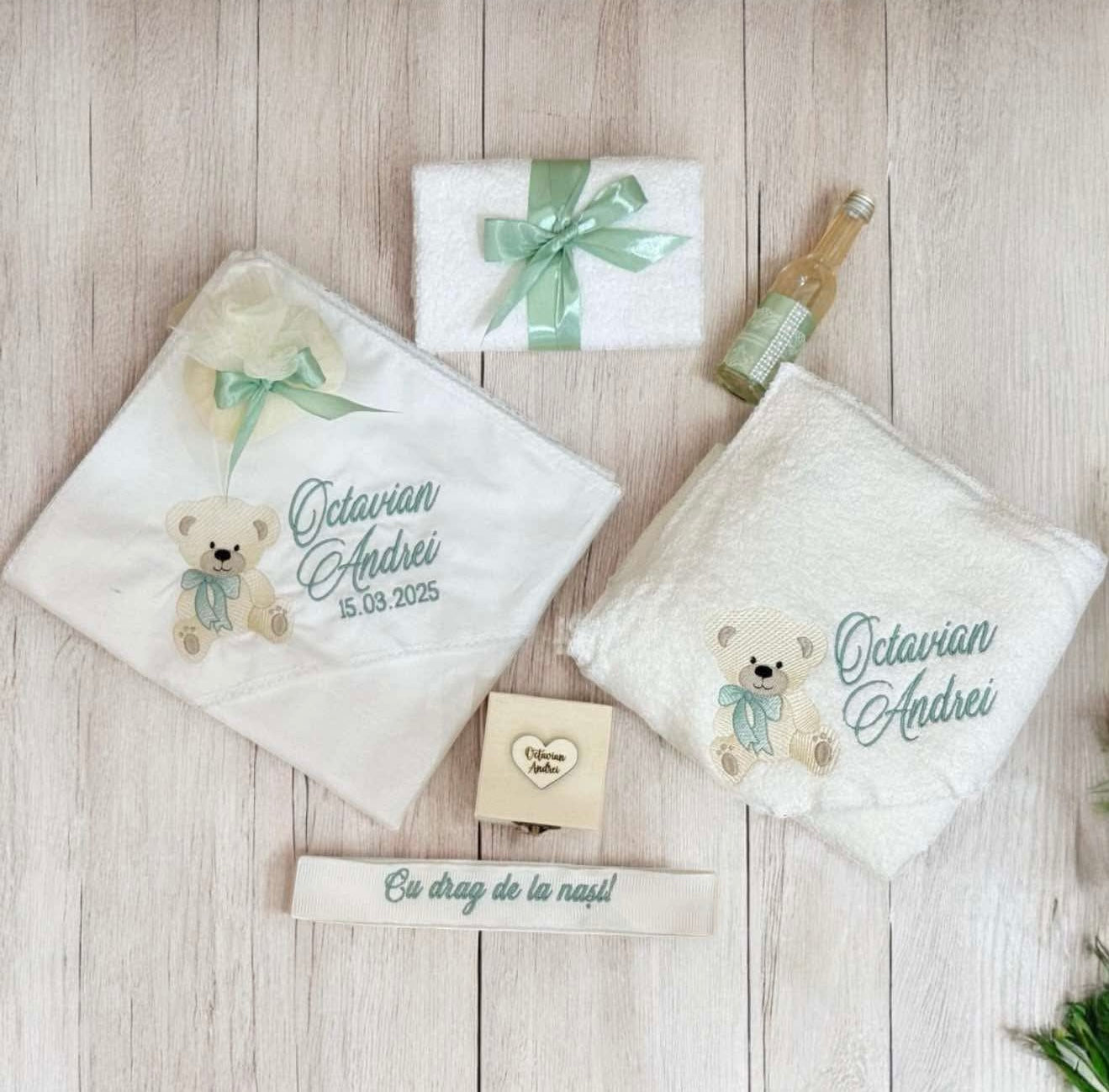 Transformă ziua botezului într-o poveste de neuitat cu acest trusou  personalizat cu ursuleț și accente verde mentă. Realizat cu grijă și pasiune, setul conține toate elementele esențiale pentru slujba de botez, oferind rafinament, căldură și o notă jucăușă perfectă