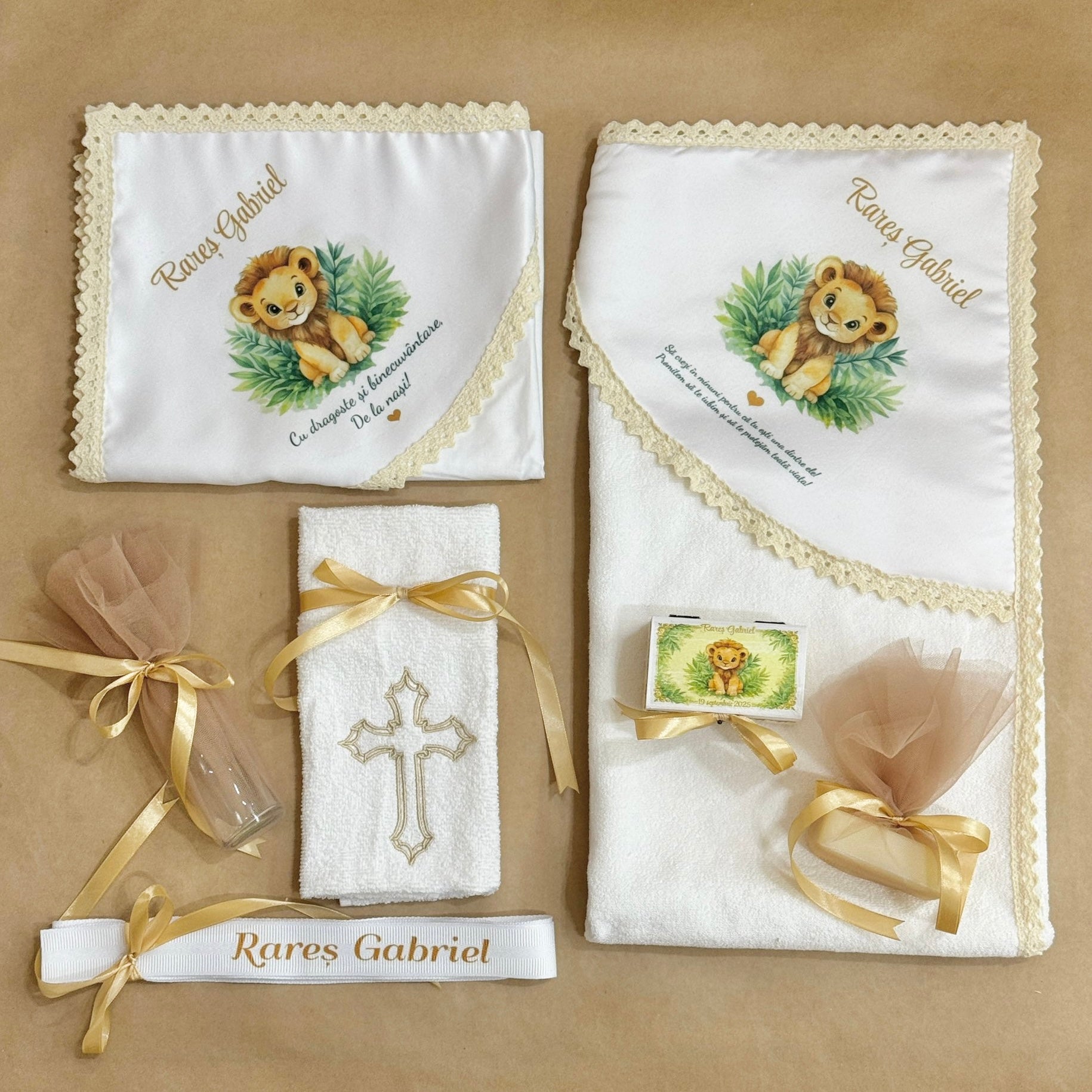 Trusou personalizat printat pentru botez nou-nascut este compus din prosop mare, prosop mic, crisma, fasa, sapun, cutie prima suvita, sticluta mir. Trusoul este printat cu imaginea si detaliile dorite de catre client. Tema din imagine este leut potrivita pentru baiat