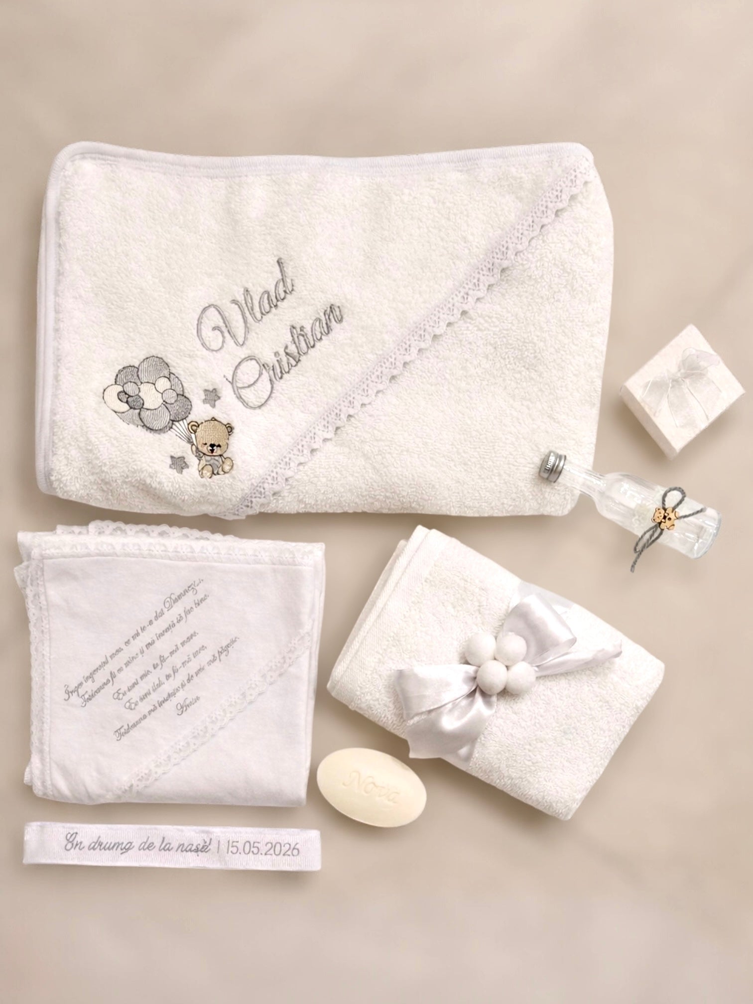 Trusou personalizat brodat pentru botez nou-nascut este compus din prosop mare, prosop mic, crisma, fasa, sapun, cutie prima suvita, sticluta mir. Trusoul este brodat cu imaginea si detaliile dorite de catre client. Tema din imagine este ursulet model potrivit pentru fetițe si baietei