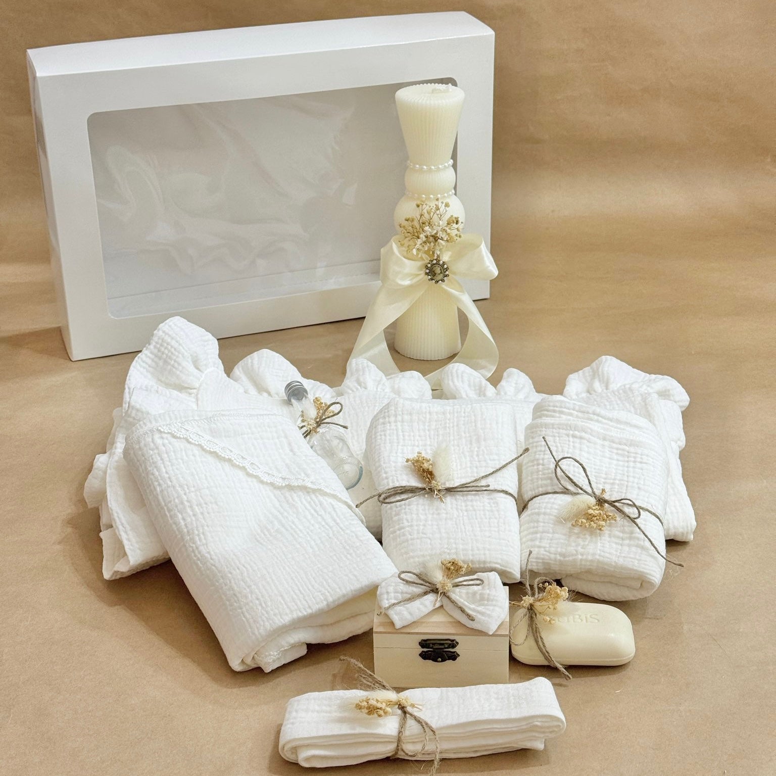 -trusou muselina compus din 8 piese (paturica muselina, prosop bebe muselina, pânză mir muselina, prosop preot muselina, fașă muselina, sticluță pentru mir, cutiuta primacsuvita, săpun preot și prosop preot)