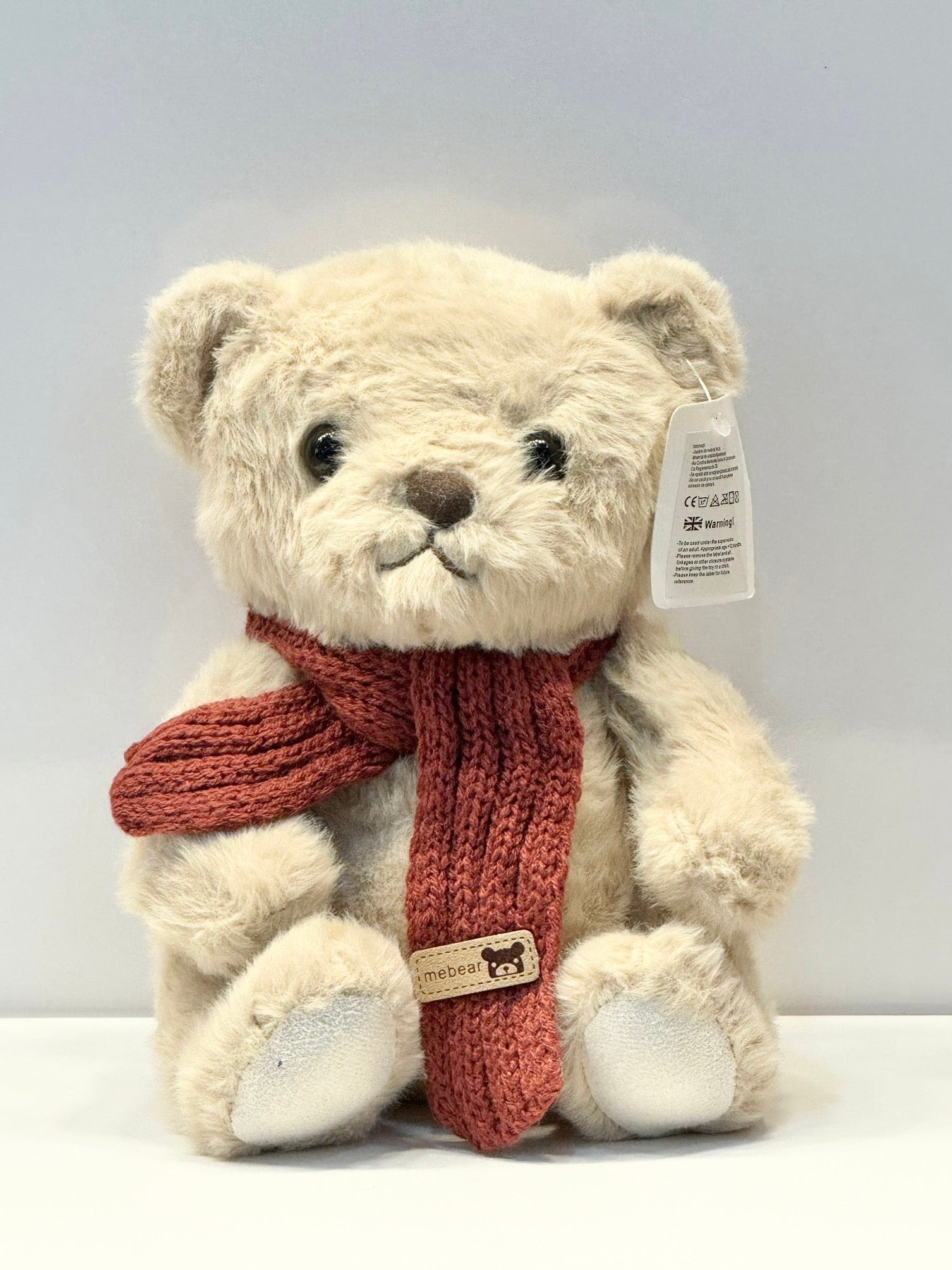 Ursulet de pluș bej cu fular tricotat.